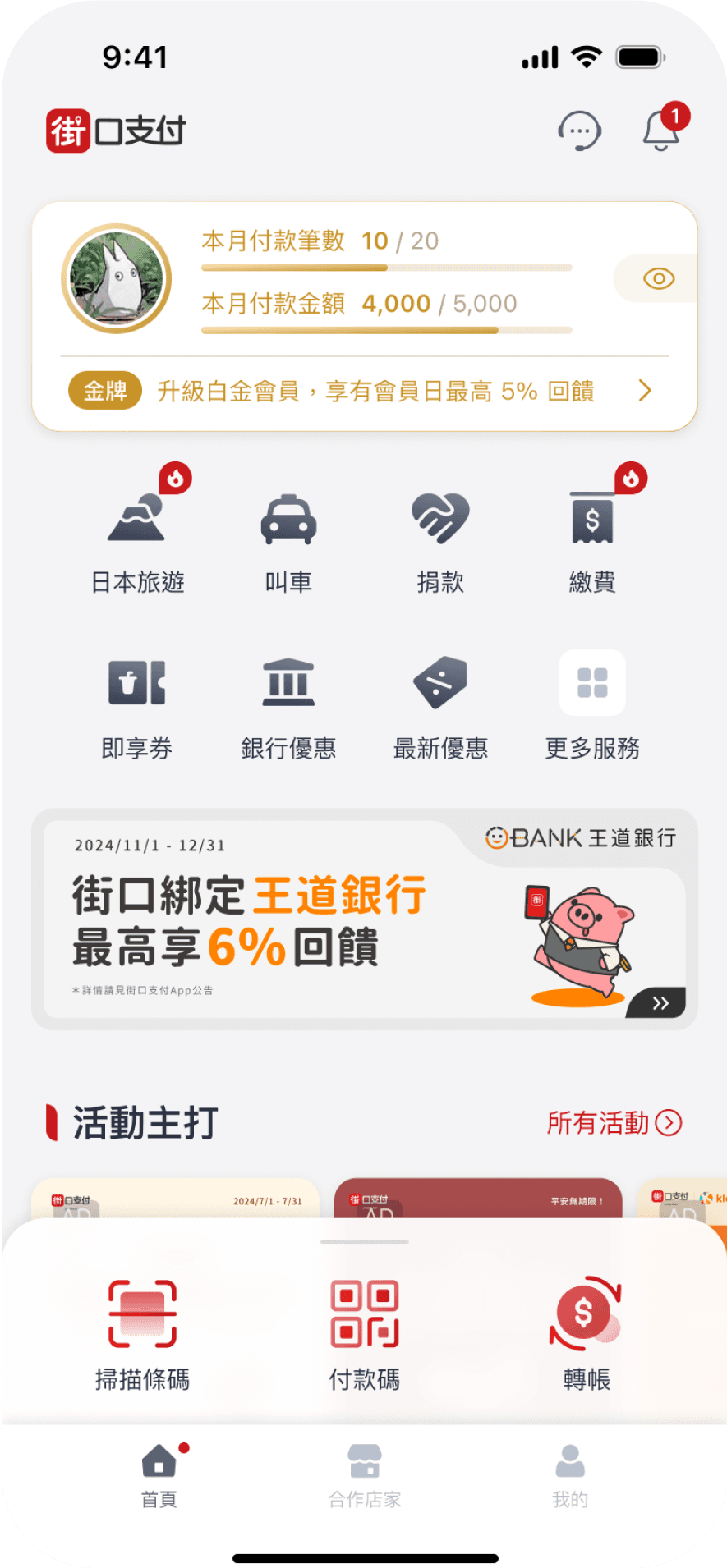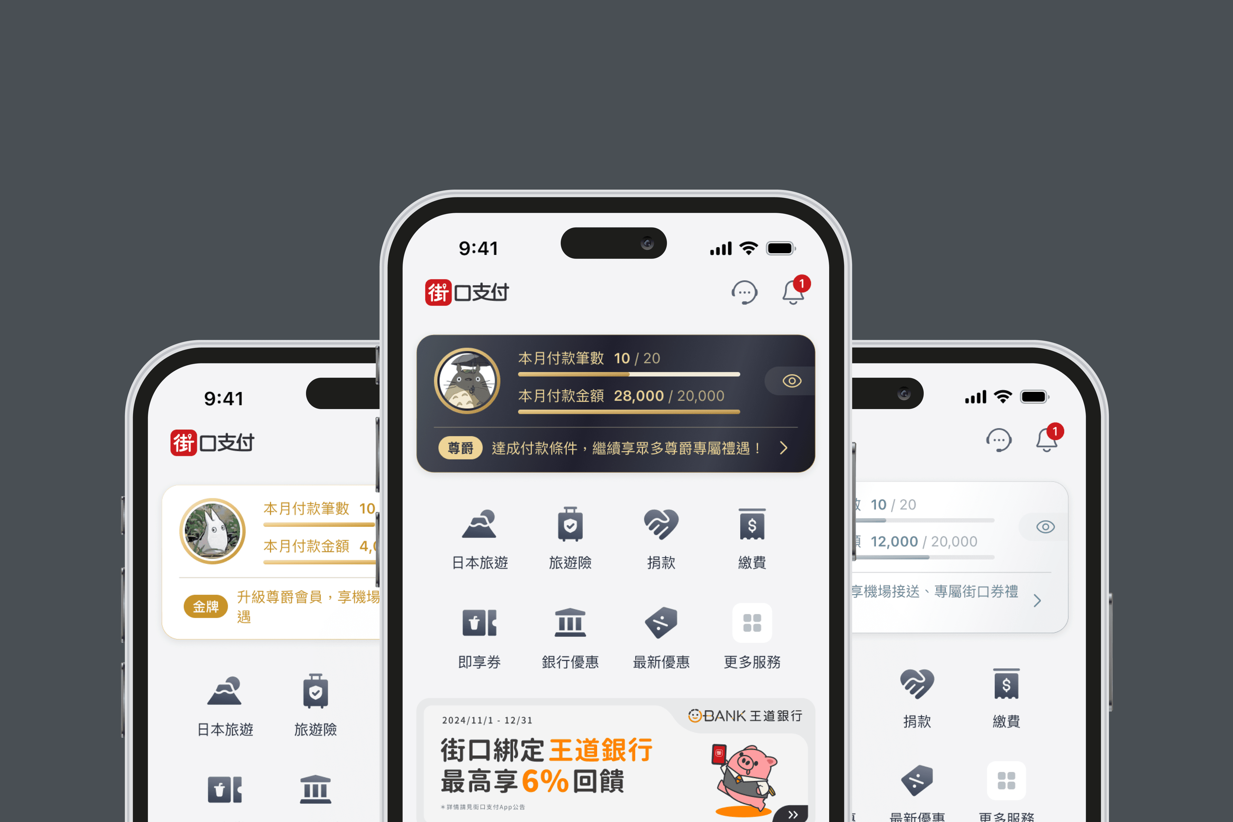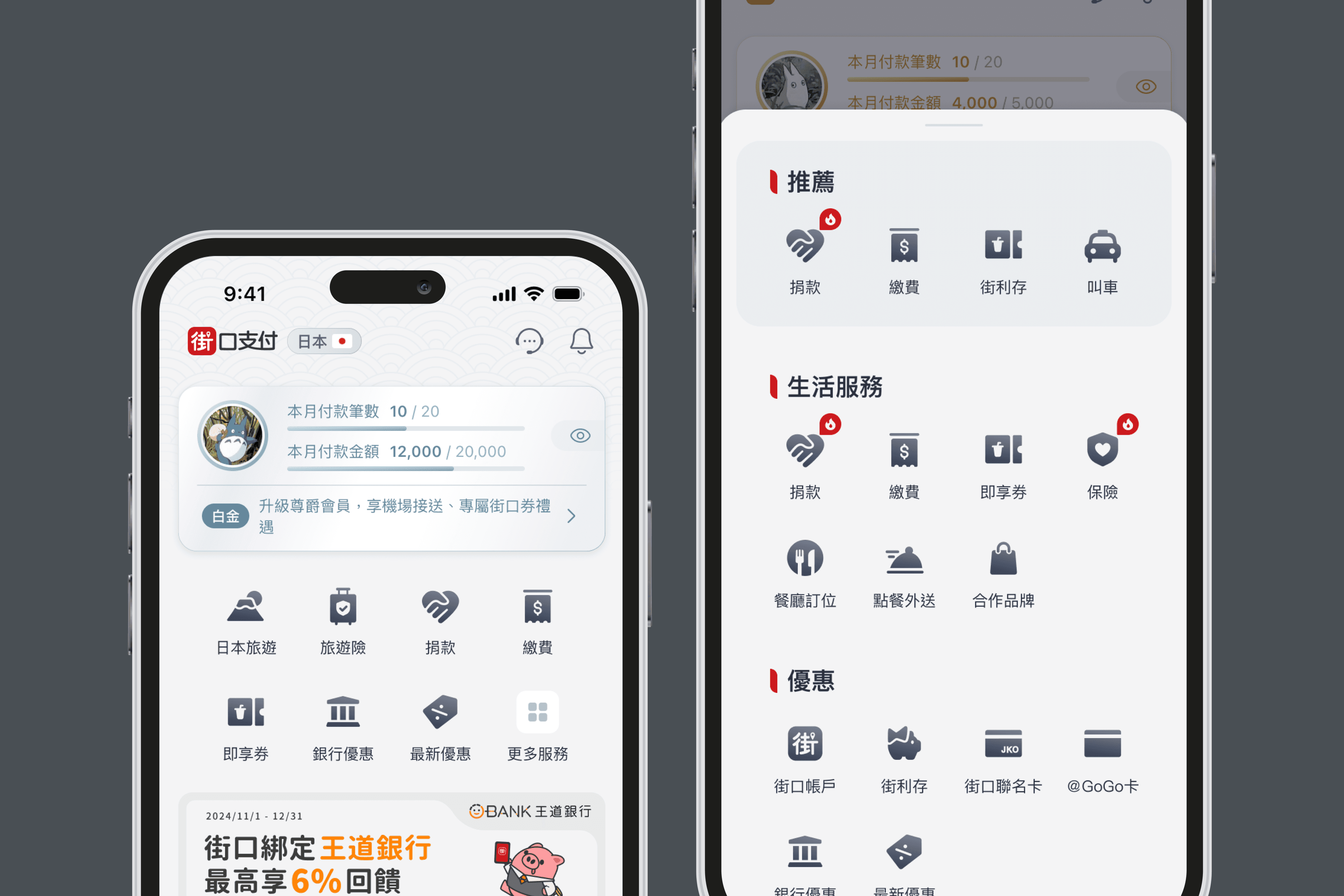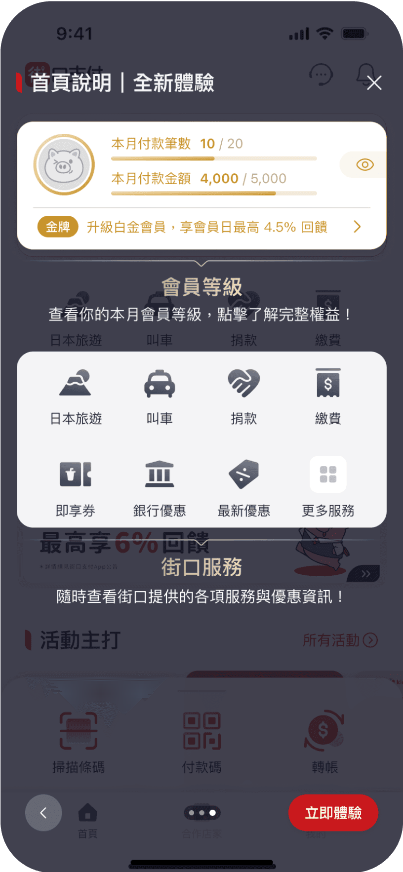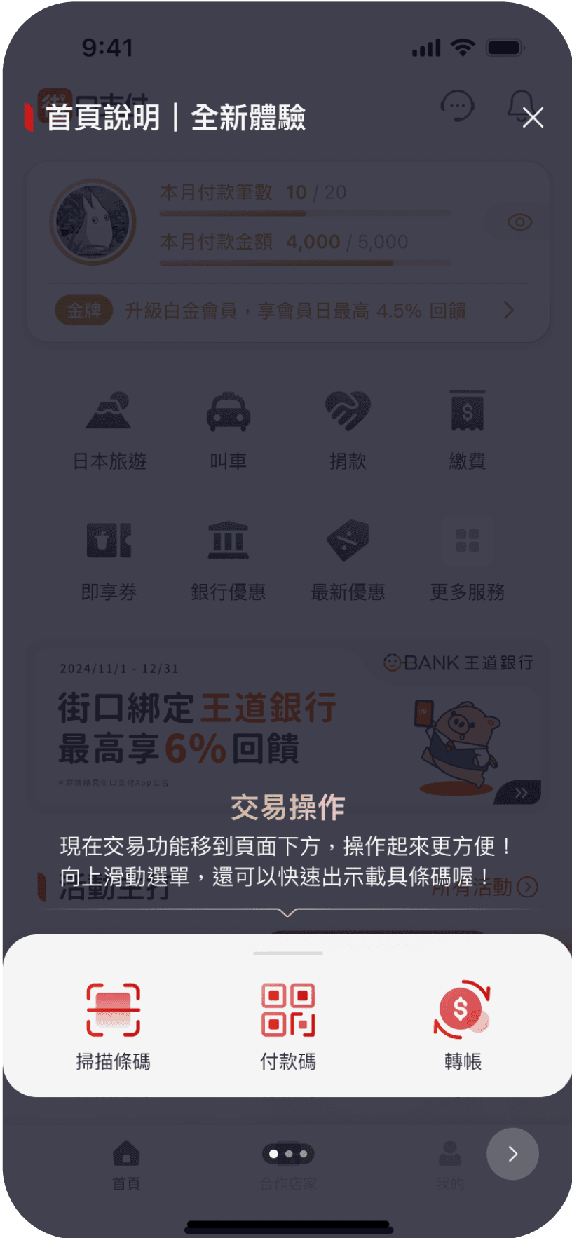 因應會員權益卡片佈局調整,我們將原本位於首頁上方的核心功能(轉帳、付款、掃碼)改為整合至底部操作區,提升單手操作的便利性,並透過三段式展開高度,讓使用者能依需求快速找到想用的功能,提升首頁的整體操作體驗。